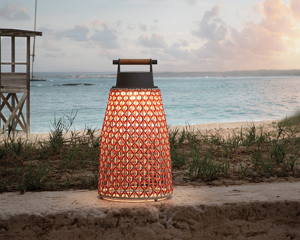 Portable, rechargeable table lamp with soft, diffused light filtered through a handcrafted woven shade made of polyethylene fiber.