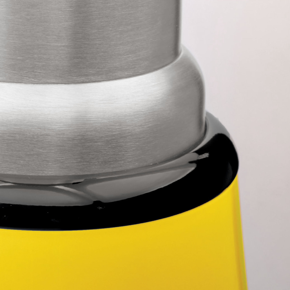 Un difusor de metacrilato opal blanco, un tubo telescópico de acero inoxidable y una estructura de aluminio pintado en amarillo brillante. El anillo central, la base y el pomo de fijación del difusor están realizados en metal pintado en negro brillante.