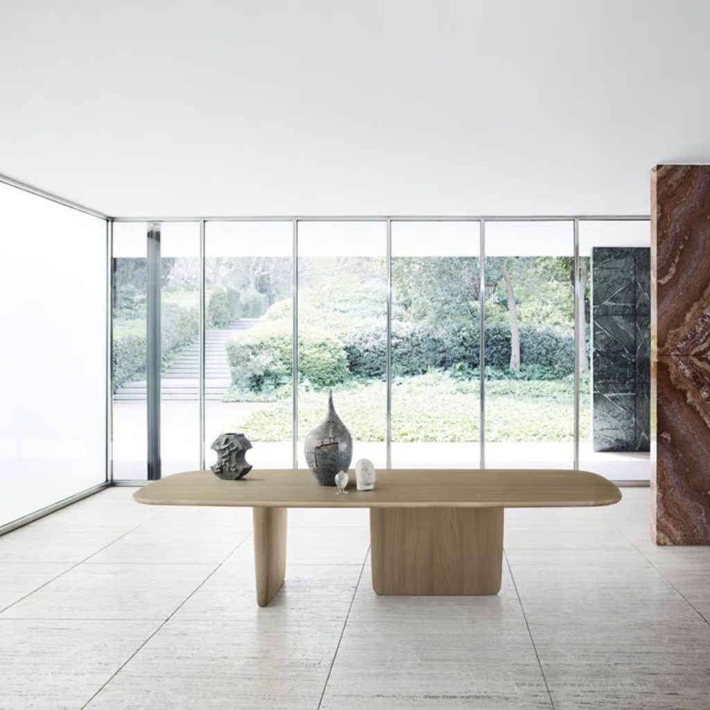 Tobi-Ishi is a sculptural table that makes reference, stylistically and in its very name, to the ornamental stones used in traditional Japanese gardens. This iconic table brings together functional features with a statuesque appearance, with truly amazing results. The overhanging top and bases look different depending on the viewpoint. With its sculptural line Tobi-Ishi becomes the protagonist of the space.