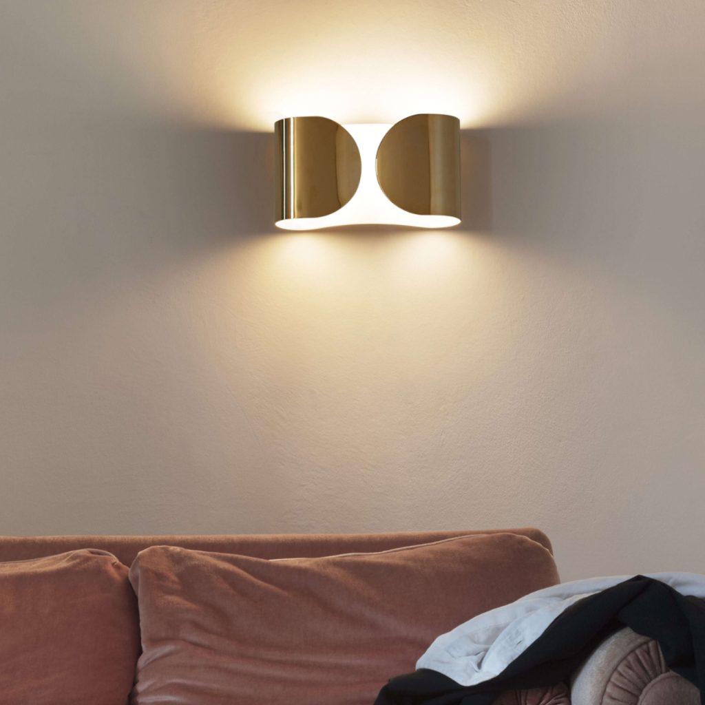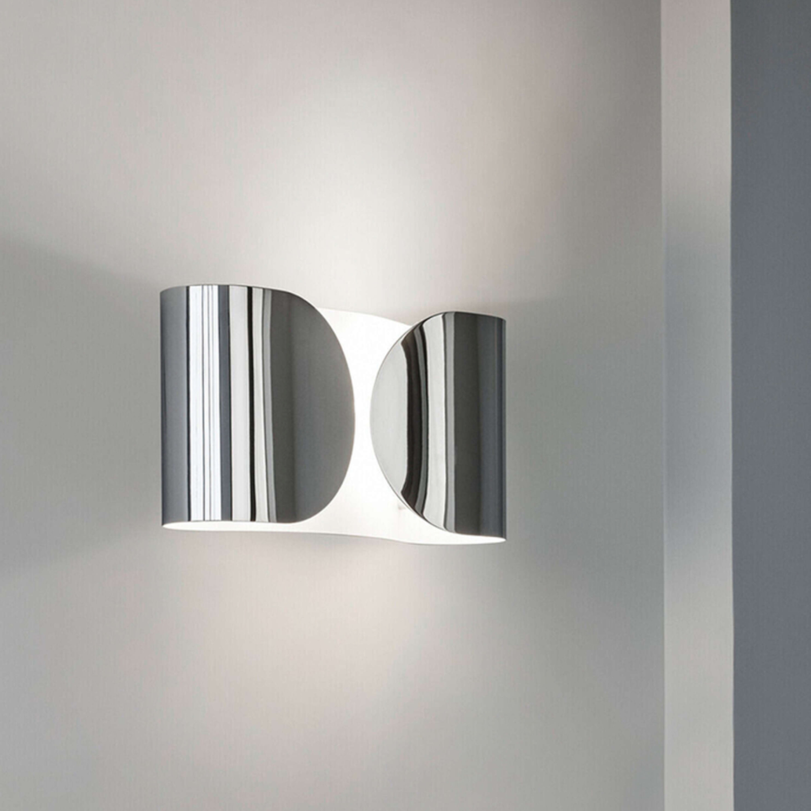 Lámpara de pared de luz directa /indirecta/ difusa parcialmente. El soporte de a pared es de acero troquelado, plegado y barnizado en polvo, de color blanco brillante. Difusor de metal troquelado, curvado y barnizado en polvo.