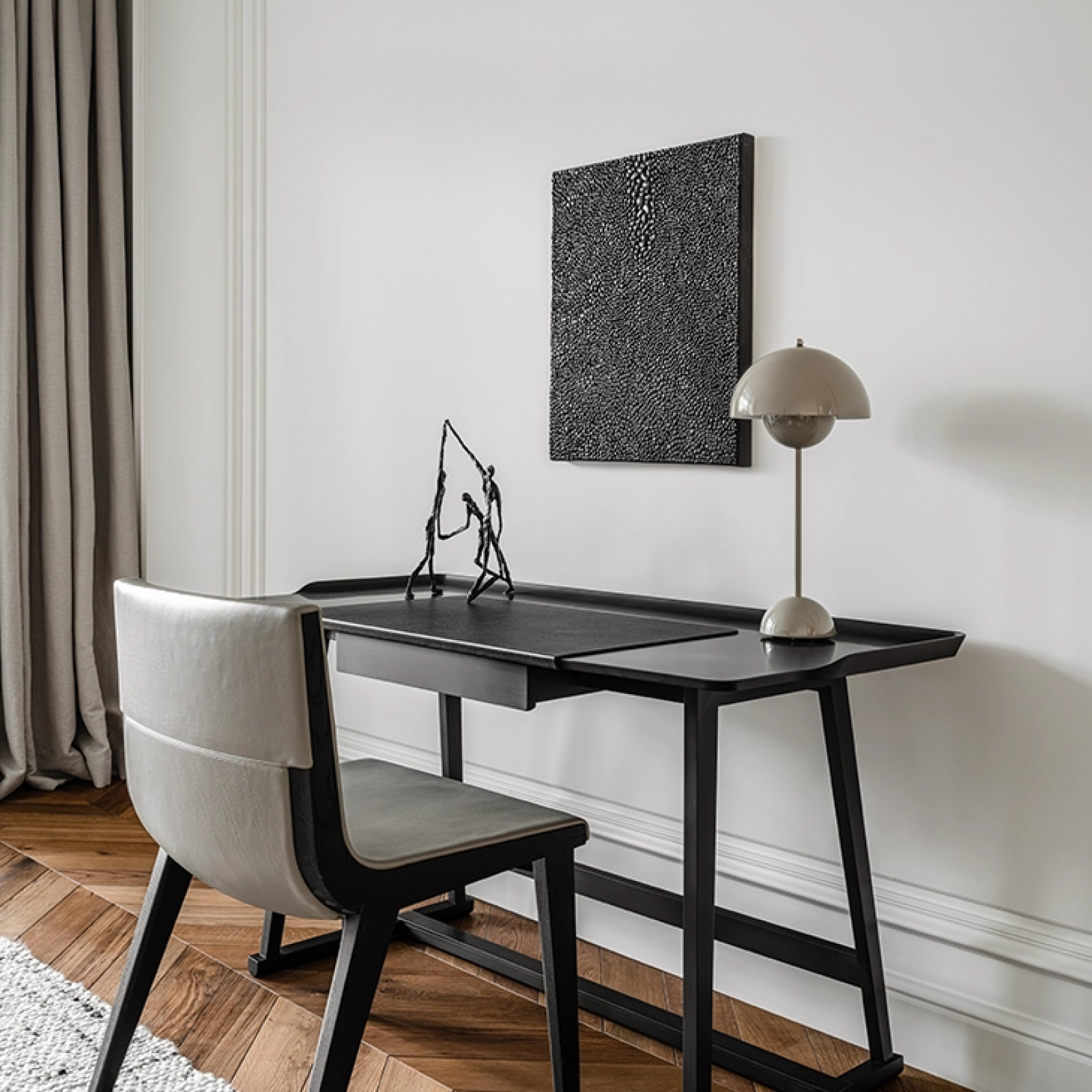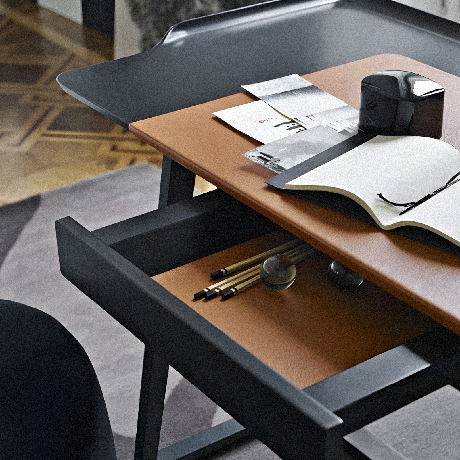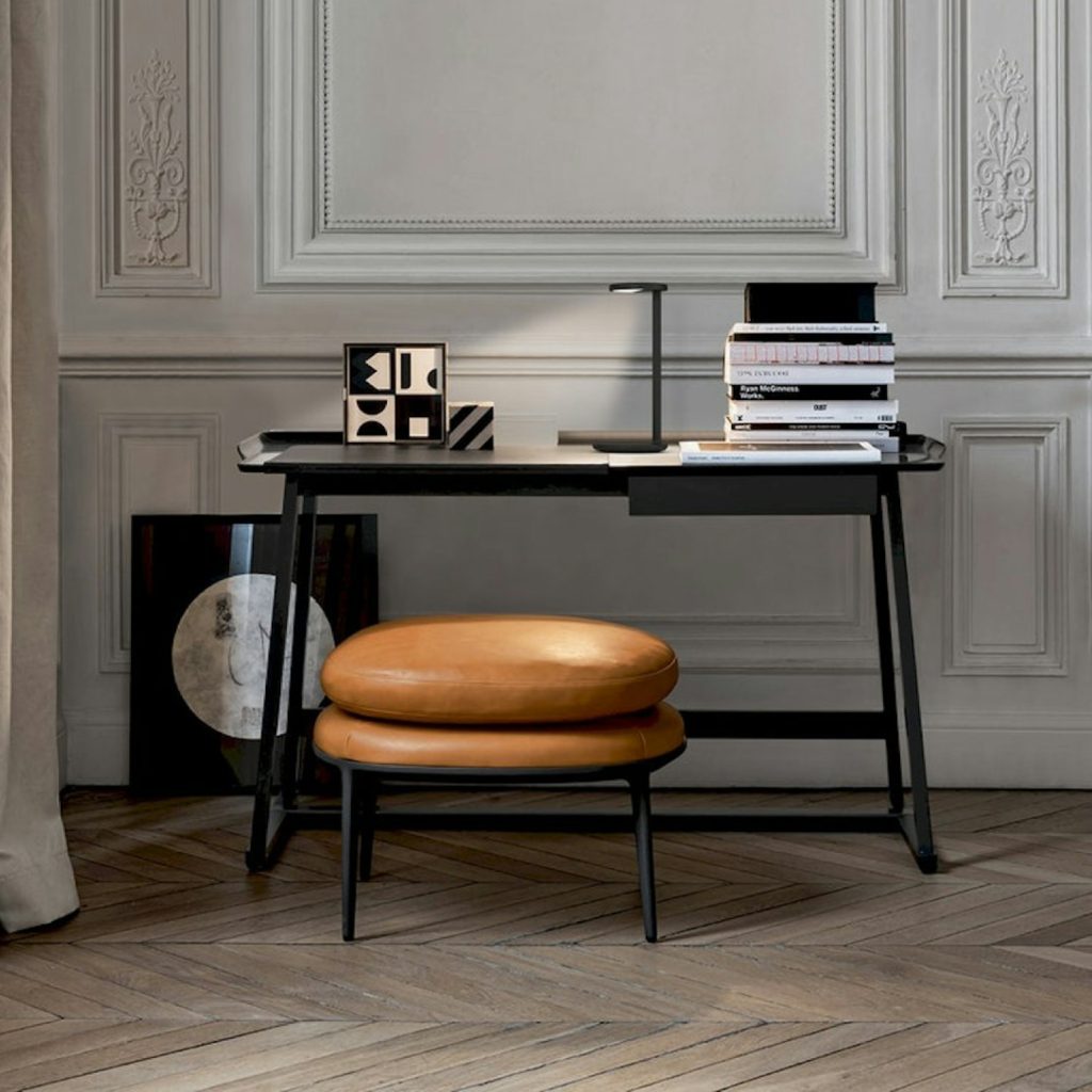 El escritorio Recipio ’14 se caracteriza por un marco trípode de madera maciza y una superficie de espuma de poliuretano estructural Baydur® con líneas suaves y un diseño en forma de bandeja. Destaca especialmente su sofisticado acabado con efecto de goma laca disponible en una variedad de colores. La superficie incluye un pequeño accesorio extraíble recubierto de cuero, un elemento funcional que aporta a la estética refinada del escritorio.
