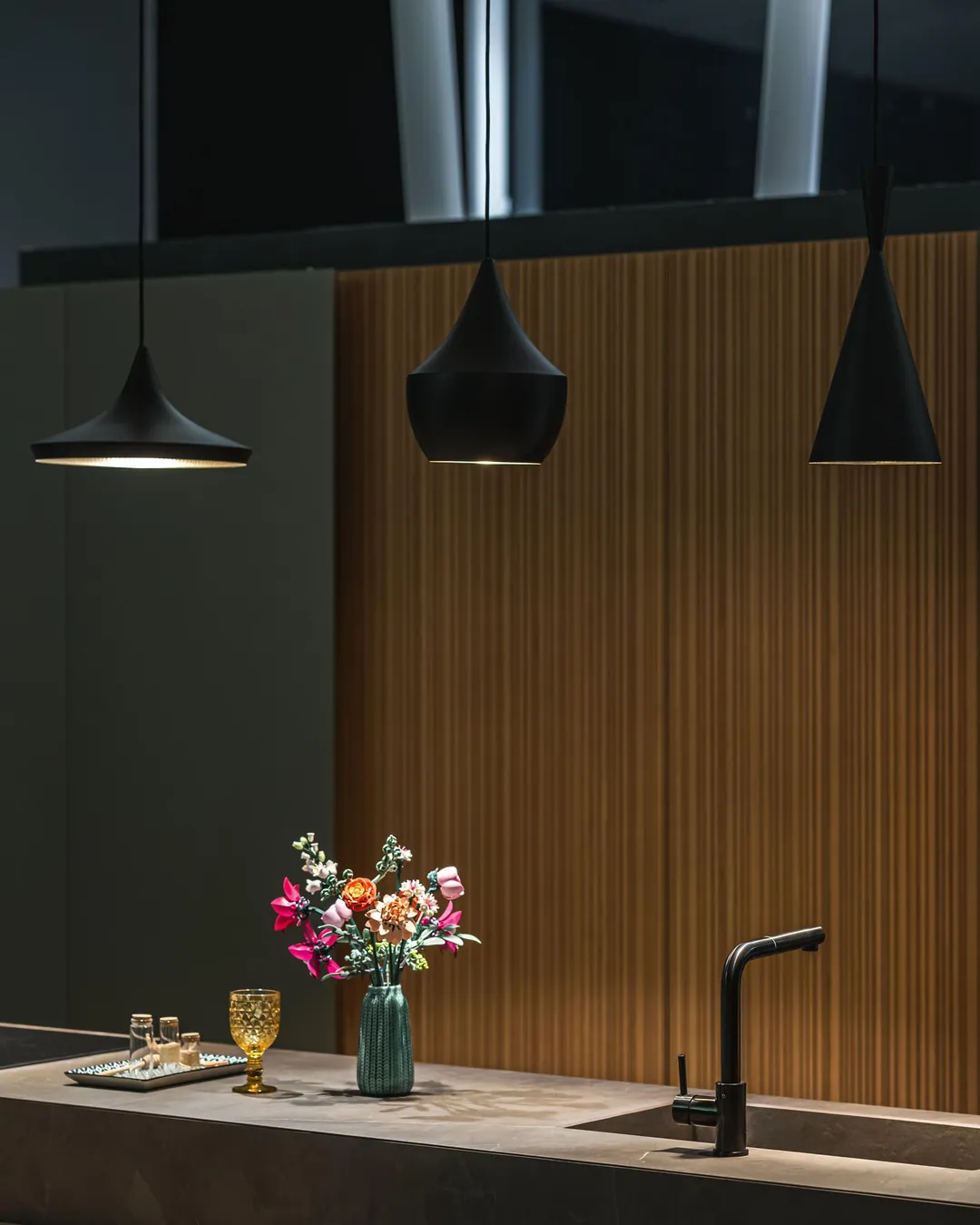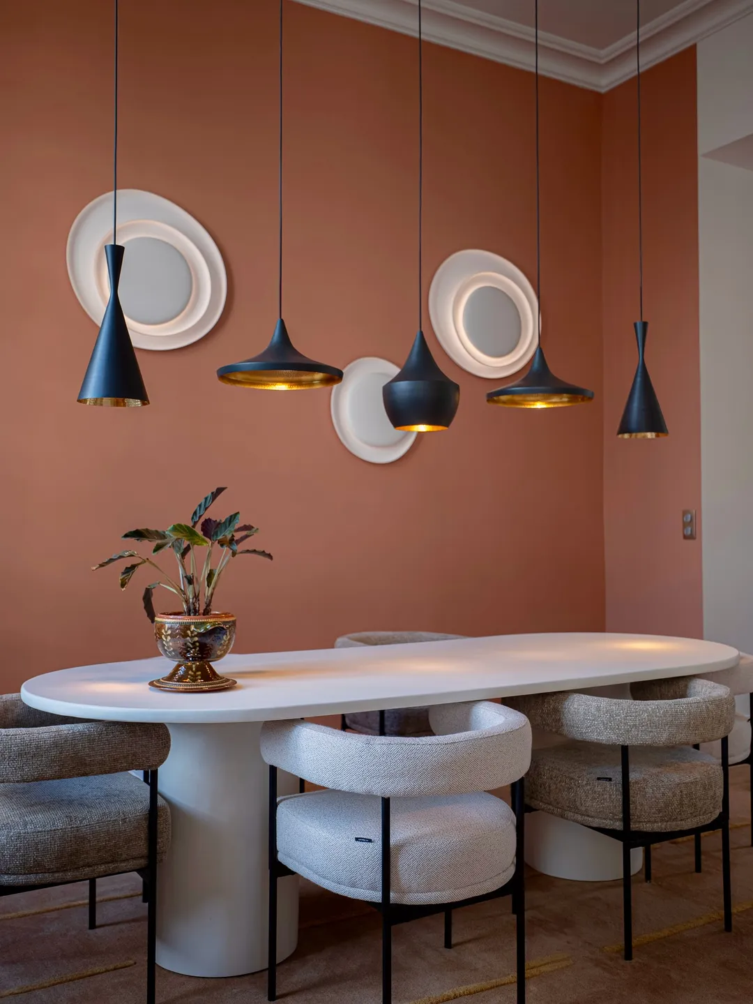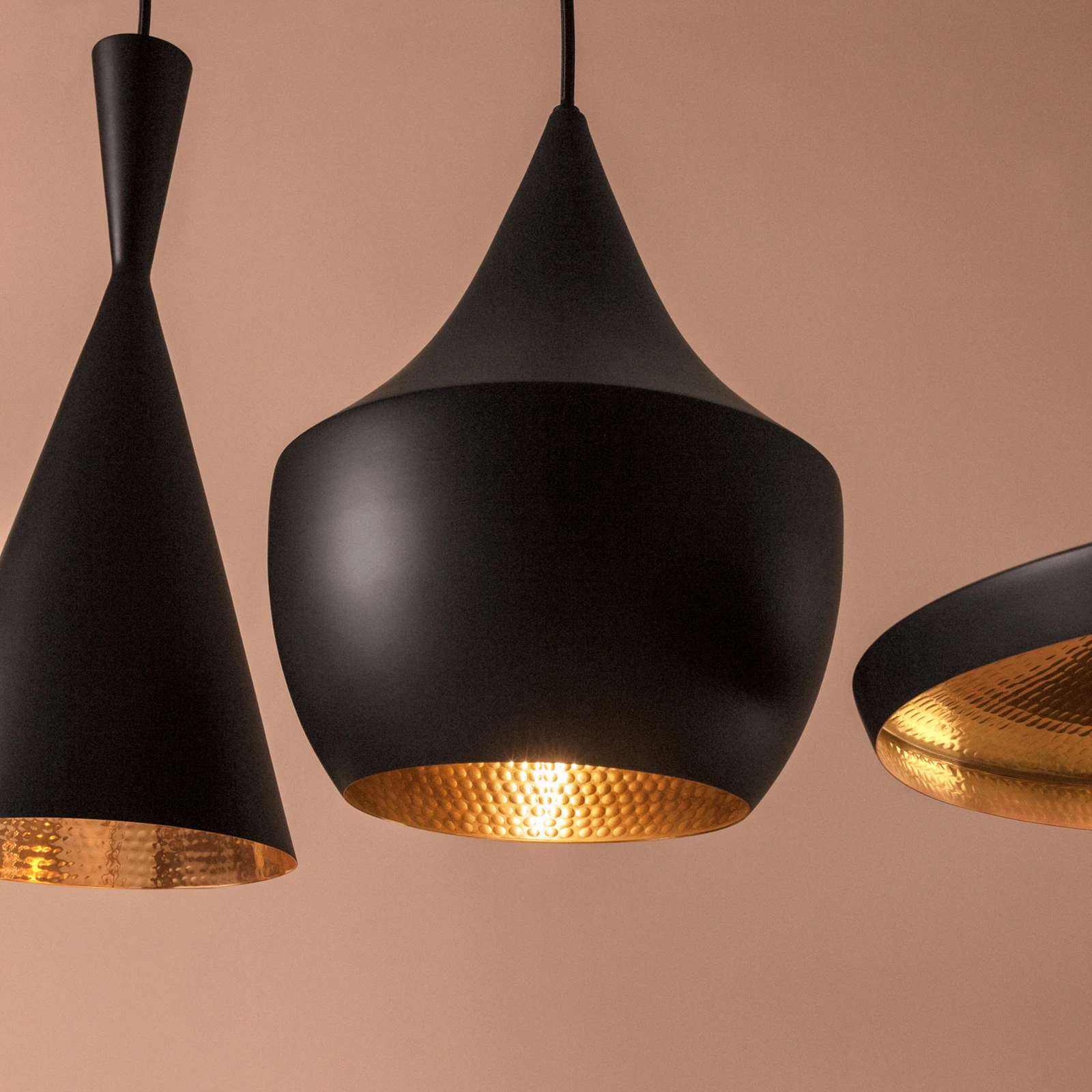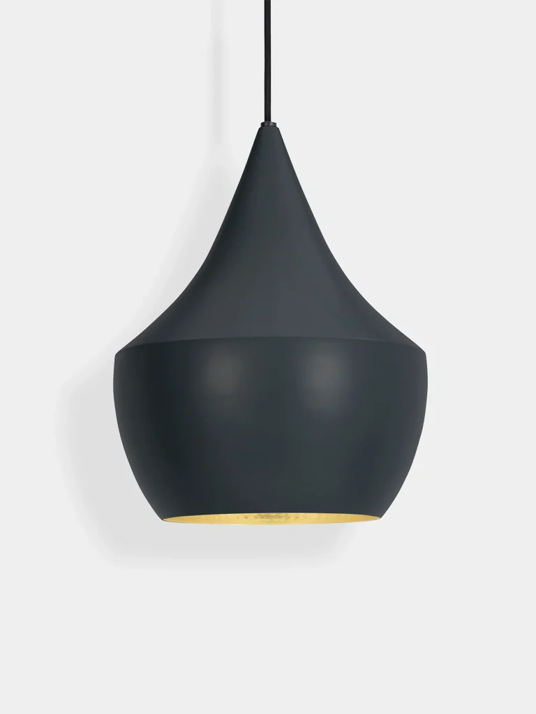 Beat Fat es una lámpara colgante negra artesanal con un cálido interior dorado. Su superficie martillada refleja una luz suave, mostrando la belleza de la artesanía. Con su característico diseño, aporta un toque de estilo a salones, comedores, cocinas o pasillos.