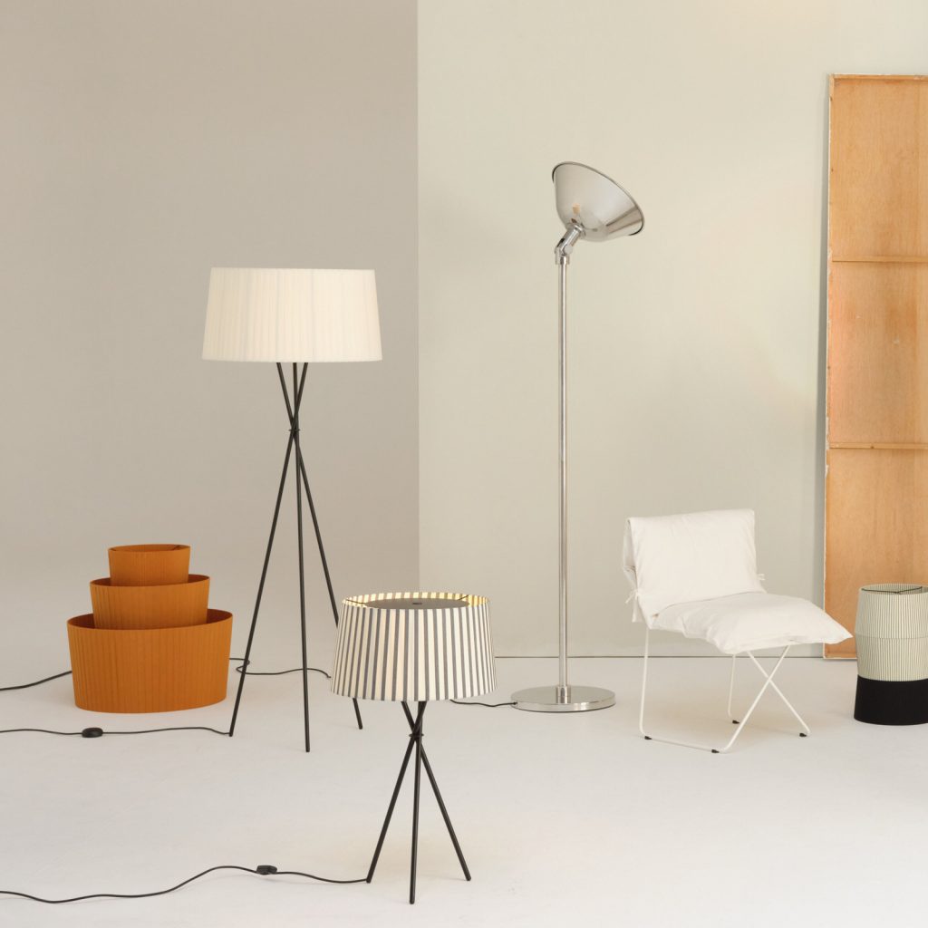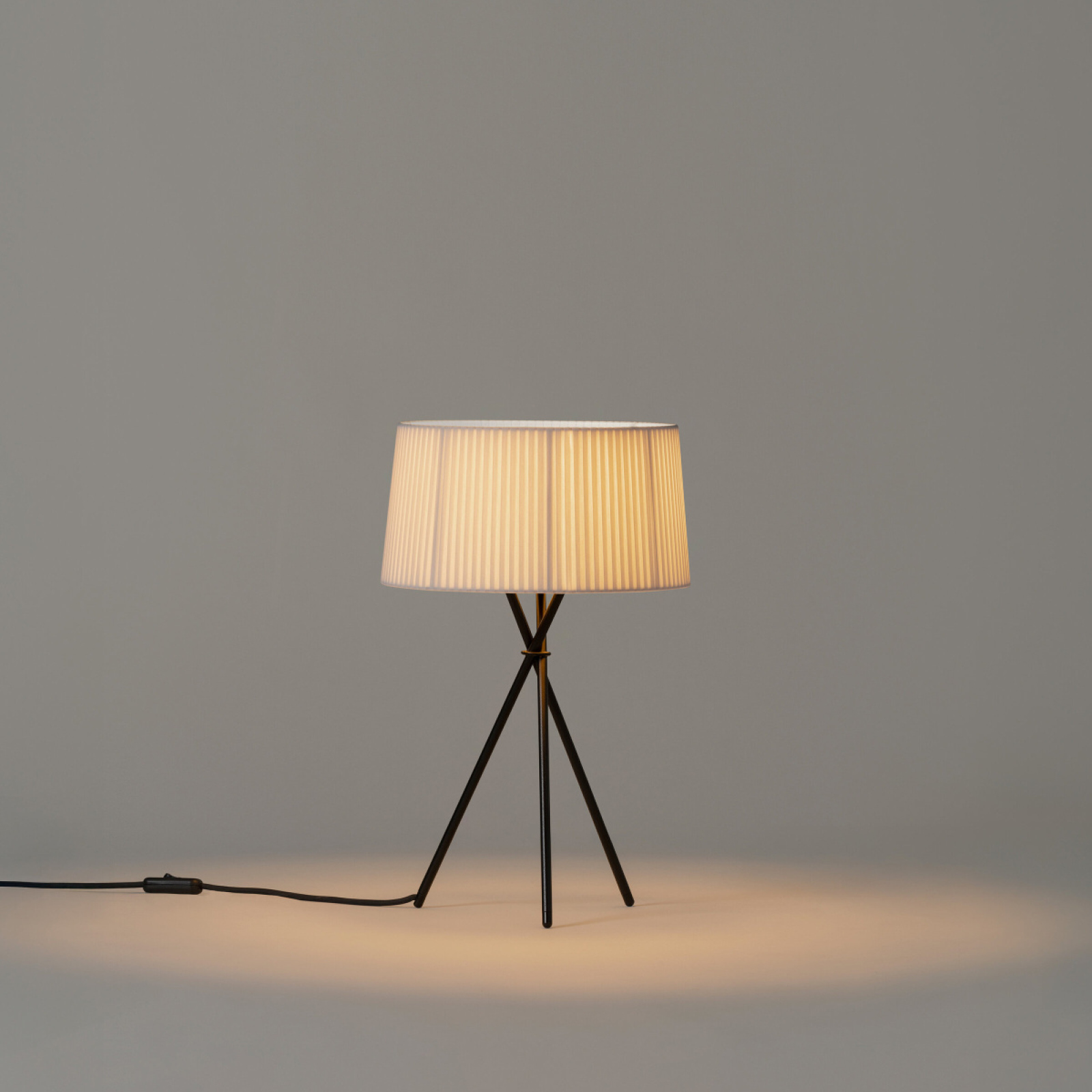 El nombre Trípode honra al haz de tres tubos negros unidos que sostienen un amplio tambor acanalado. Encendida, proporciona una luz cálida; apagada, se convierte en una escultura volumétrica. Trípode humaniza espacios neutros con la sobriedad colorista de su pantalla, encintada manualmente, vuelta tras vuelta.