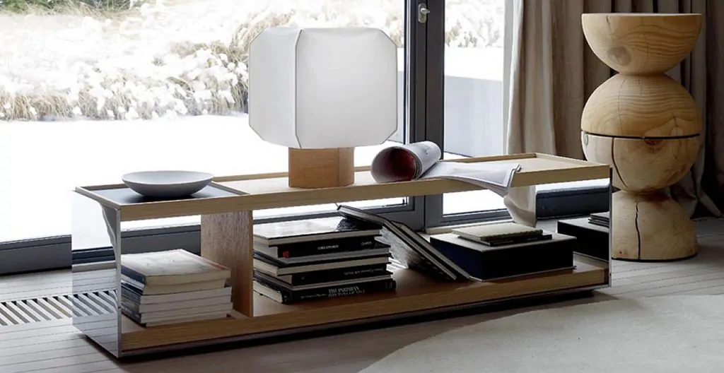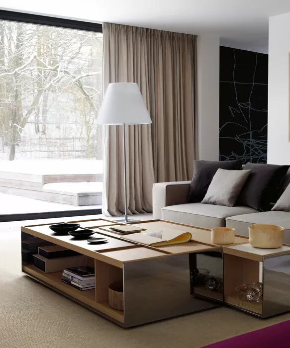 Serie de mesa de centro cuadrada, disponible en dos medidas. Con el sobre superior en cristal permite ver los objetos posicionados en el estante inferior, como pueden ser libros, esculturas, etc… Su estructura cuadrada en tubo de acero puede ser en acabado blanco.