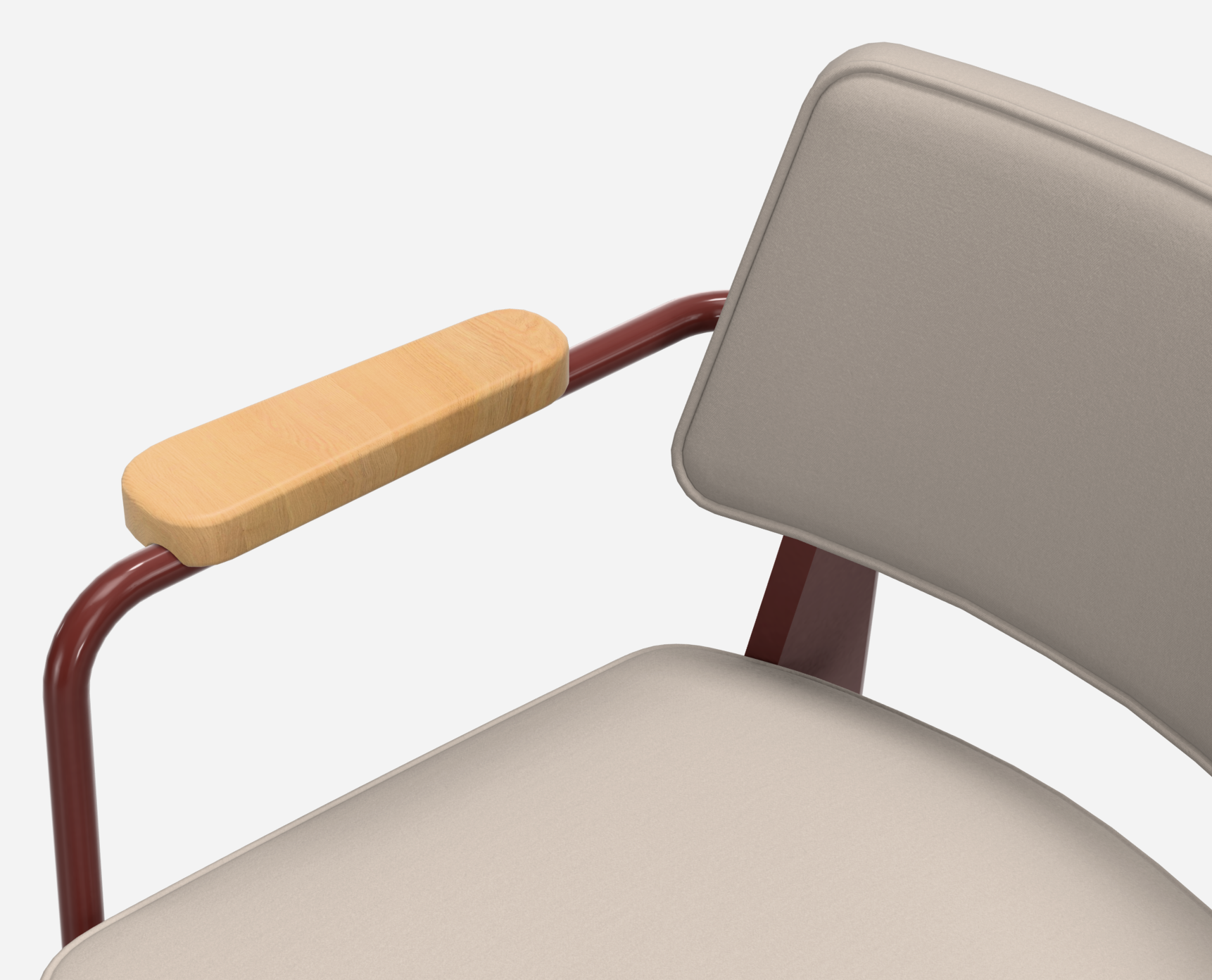 Tejido twill perla. Estructura de chapa de acero rojo japonés. Reposabrazos de roble macizo.